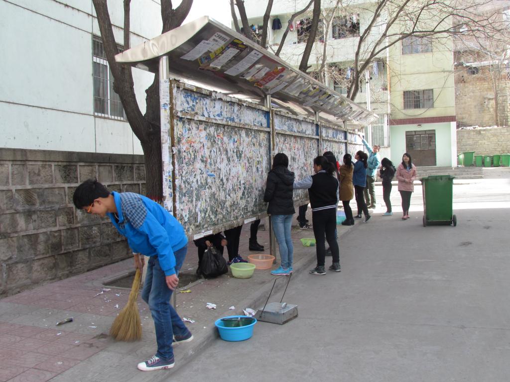3月21日上午,我院组织志愿者清理了校园公示栏上的无用广告,清洁了校门口的墙壁和自动门。活动中虽然出现了被冷水冻红的手指、磕碰造成的小伤口等小困难,但同学们还是在欢声笑语中完成了志愿工作。