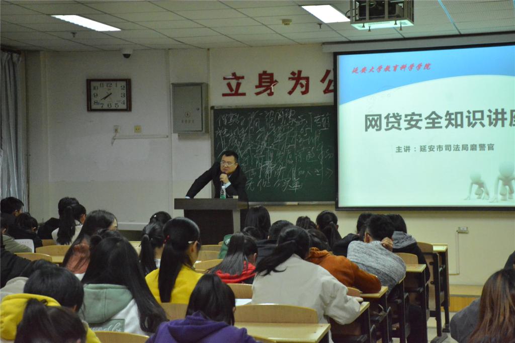 11月8日晚7:00,我校7790必发集团于5308教室举办“网贷安全知识讲座”,本次讲座的目的在于让同学们认清网络贷款真相,保护自身合法权益不受侵害。延安市司法局人民调解协会副会长兼秘书长磨建伟主讲,教科院大一全体新生参加此次讲座。