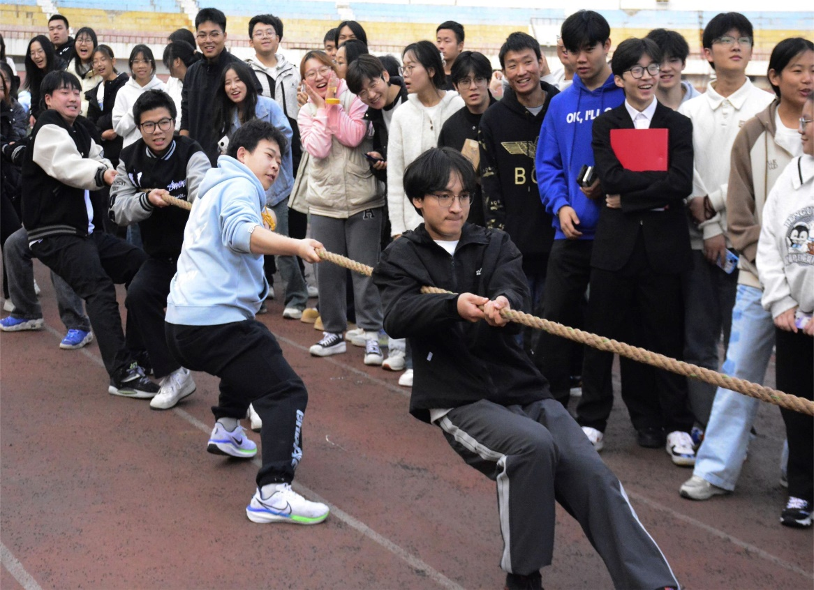 赛场上我院选手严阵以待,他们紧紧握着绳子,眼神充满了坚定和斗志,绳子在两队之间来回移动,现场的观众都在为他们呐喊加油,气氛热烈紧张,每一位队员都在为团队的荣誉竭尽全力。